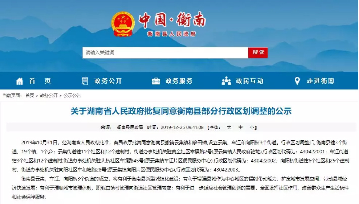 省政府批复同意!衡南县设立云集、车江和向阳桥3个街道