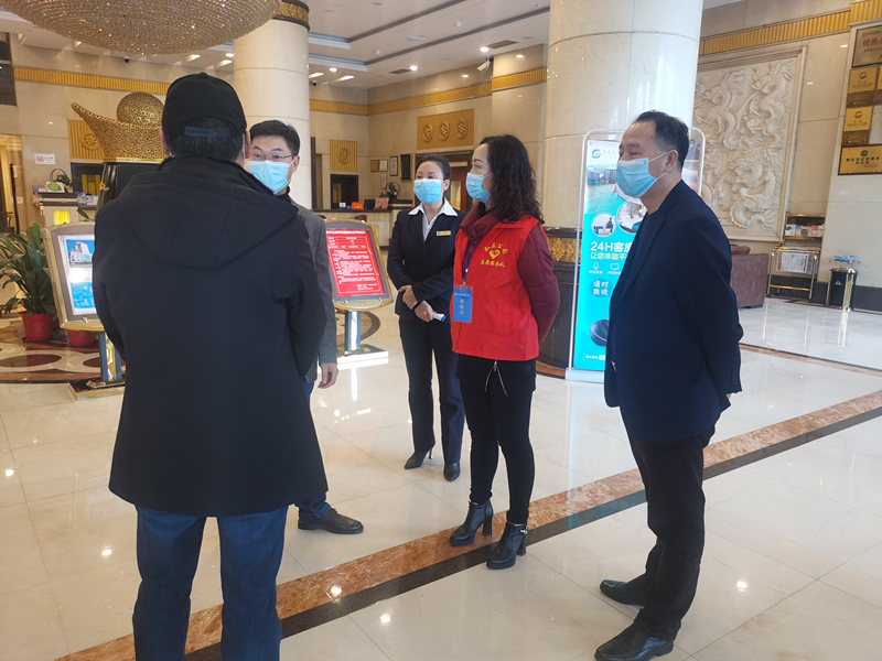 2月14日,弘湘国投工会主席陈新骥和商业大厦负责人蒋腊生一同前往商业大厦租赁单位神龙大酒店检查指导疫情防控工作,了解酒店疫情防控措施、复工人员健康状况以及企业防疫所存在困难,帮助酒店复工复产。
