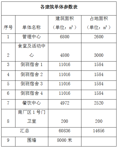 4、采购项目内容包括:管理中心、食堂及活动中心、倒班宿舍(暂定四栋)、餐饮中心、南厂区门卫室、围墙立面概念设计,各单体参数如下表: