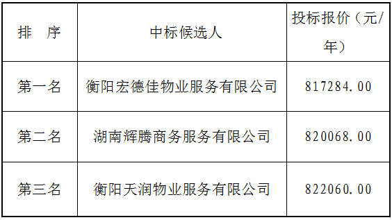衡阳弘湘国有投资(控股)集团有限公司院内物业服务采购项目于2020年6月29日上午10时00分(北京时间)进行了比选开标、评标活动,评标委员会按照招标文件规定的评标办法及原则进行评定,确定中标候选人如下: