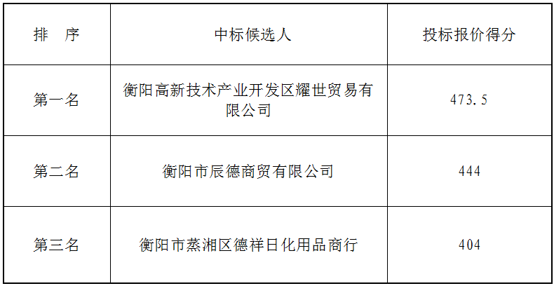 衡阳市衡府宾馆有限公司(养正园)宾馆客房用品(水果、副食类)于2021年1月27日下午2时30分(北京时间)进行了比选开标、评标活动,评标小组按照招标公告规定的评标办法及原则进行评定,确定中标候选人如下: