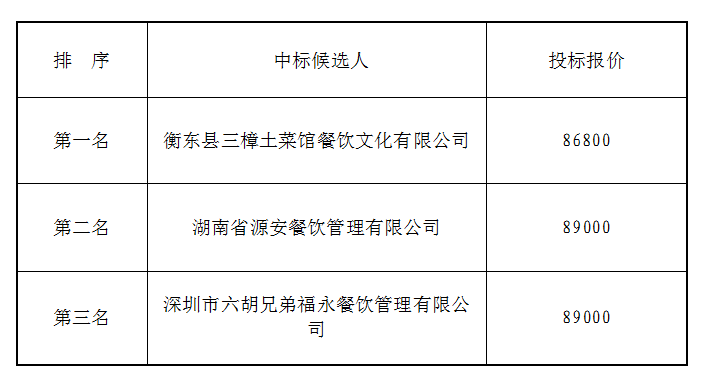 衡阳市衡府宾馆有限公司(养正园)食堂劳务于2021年7月21日上午9时(北京时间)进行了比选开标、评标活动,评标小组按照招标公告规定的评标办法及原则进行评定,确定中标候选人如下: