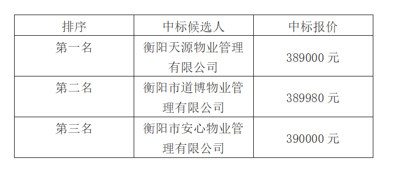 根据招标投标相关法律法规及招标文件的规定,衡拖棚户区改造(一期)安置小区前期物业管理公司比选于2021年11月4日在弘湘写字楼4楼会议室举行开标、评标会,本项目采用“低价中标法”,现将中标候选人名单公示如下: