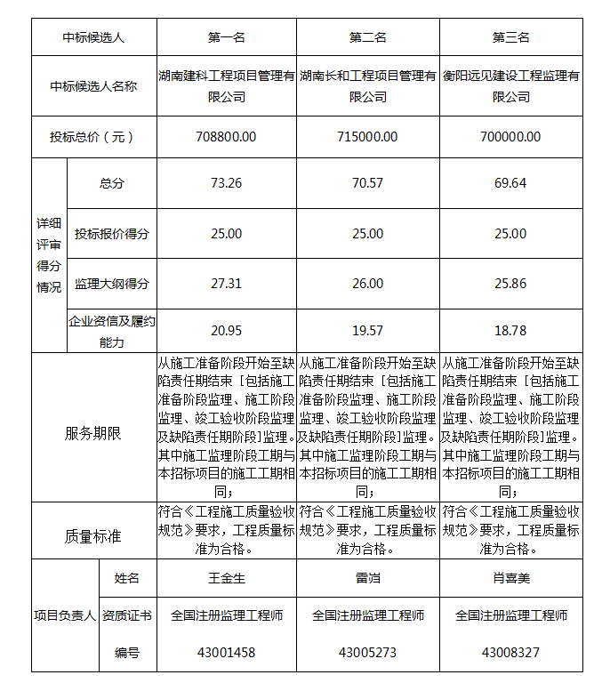 根据招标投标相关法律法规及招标文件的规定,衡阳(国际)眼镜小镇首开区创意中心新建项目监理评标工作已经结束,评标委员会按照招标文件规定的评标办法及原则进行评定,推荐中标候选人排名如下: