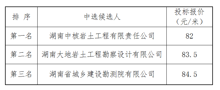 衡阳市高新区弘湘双创智造基地(眼镜小镇)-创意中心项目桩基施工超前钻勘察比选于2022年9月26日下午16时00分(北京时间)进行了比选开标、评标活动,评标委员会按照比选文件规定的评标办法及原则进行评定,推荐中选候选人排名如下: