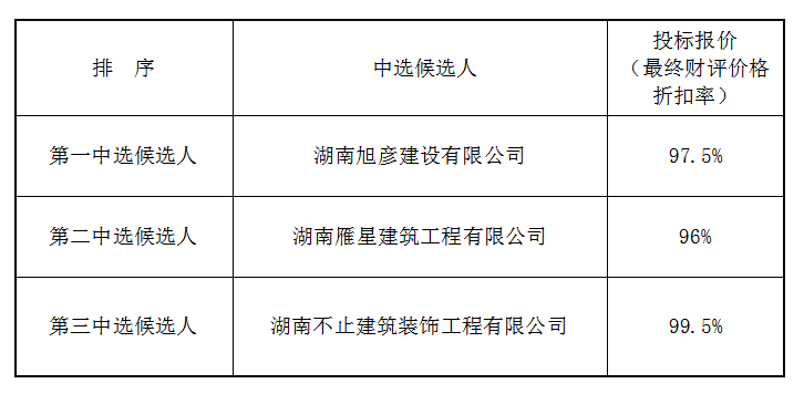 根据直接发包比选文件的规定,衡阳市高新区弘湘双创智造基地(眼镜小镇)-标准厂房A3区综合楼二次装修施工项目于2022年11月14日举行开标、评标会,本项目采用“综合评标法”,经评标委员会评审现将中选结果公示如下: