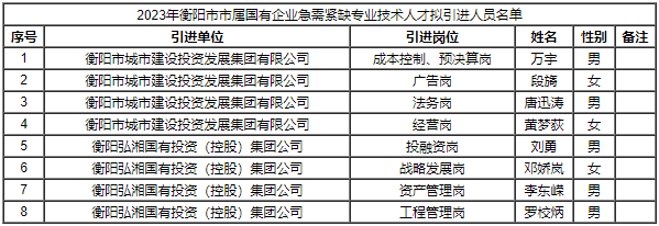 2023年衡阳市市属国有企业急需紧缺专业技术人才拟引进人员名单公示