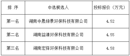 衡阳市植物园跃林路环境影响评价服务第三方中介服务机构比选于2023年7月24日下午15时00分(北京时间)进行了比选开标、评标活动,评标委员会按照比选文件规定的评标办法及原则进行评定,推荐中选候选人排名如下: