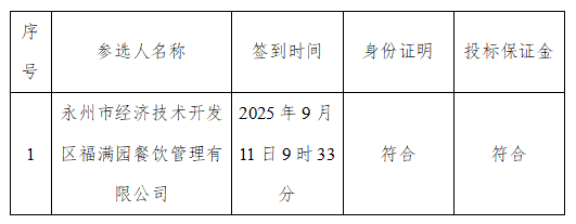 本项目于2025年09月11日10时00分在湖南省永州市冷水滩区长丰集团办公楼二楼评标室进行了开标评标活动,但在开标截止时间前提交参选文件的参选人只有一个,根据比选文件相关规定,本次比选拟做流标处理,具体评审情况如下: