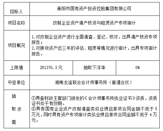 改制企业资产清产核资与租赁资产专项审计于2025年10月17日在衡阳国投4栋3楼评标室进行了随机抽取,现将相关信息予以公示。