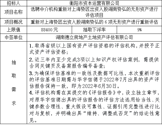 选聘中介机构重新对上海贽匠出资入股湖南贽弘的无形资产进行评估项目抽取结果公示
