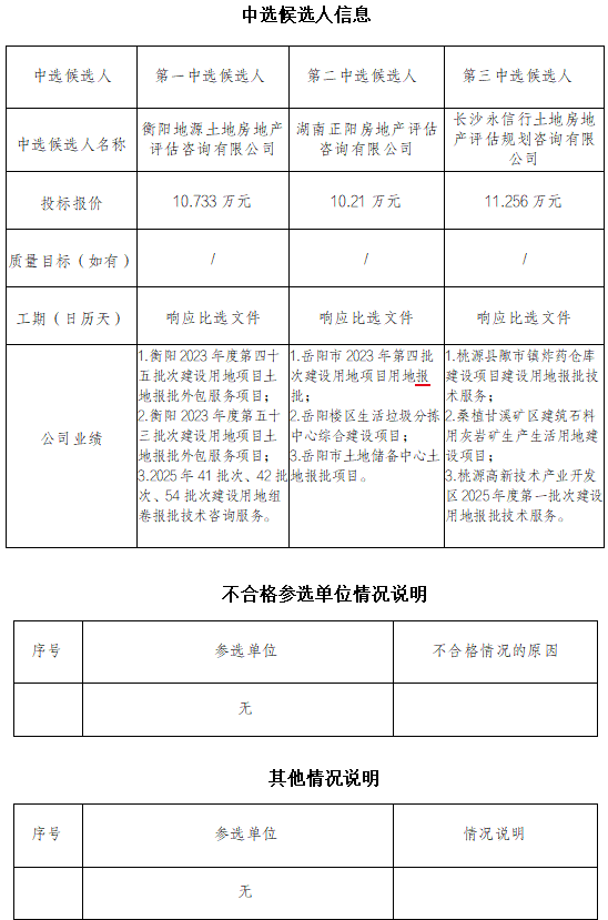 植物园片区80亩地土地组卷报批技术咨询服务 于2025年12月4日15时00分在衡阳国投4栋3楼评标室进行了比选开标、评标活动,评标委员会按照比选文件及相关法律法规规定进行评审,推荐以下三名中选候选人(排序),现将相关信息予以公示。