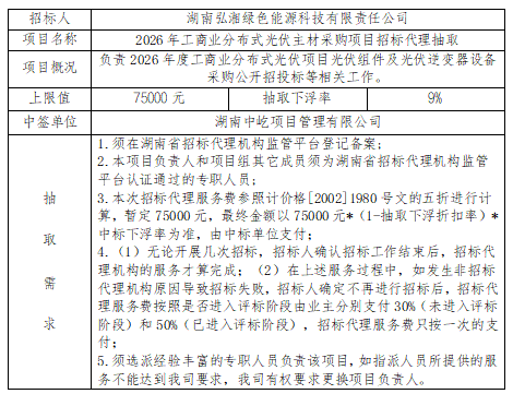 2026年工商业分布式光伏主材采购项目招标代理抽取于2026年1月27日在衡阳国投4栋3楼评标室进行了随机抽取,现将相关信息予以公示。