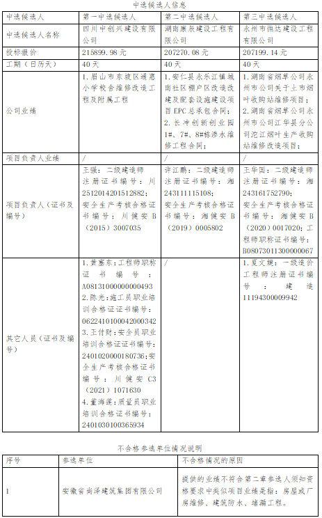 湖南长丰动力公司厂房漏水维修项目于2026年2月5日15:00(北京时间)在永州市冷水滩区长丰集团办公楼二楼评标室进行了比选开标、评标活动,评标委员会按照比选文件及相关法律法规规定进行评审,推荐以下三名中选候选人(排序),现将相关信息予以公示。